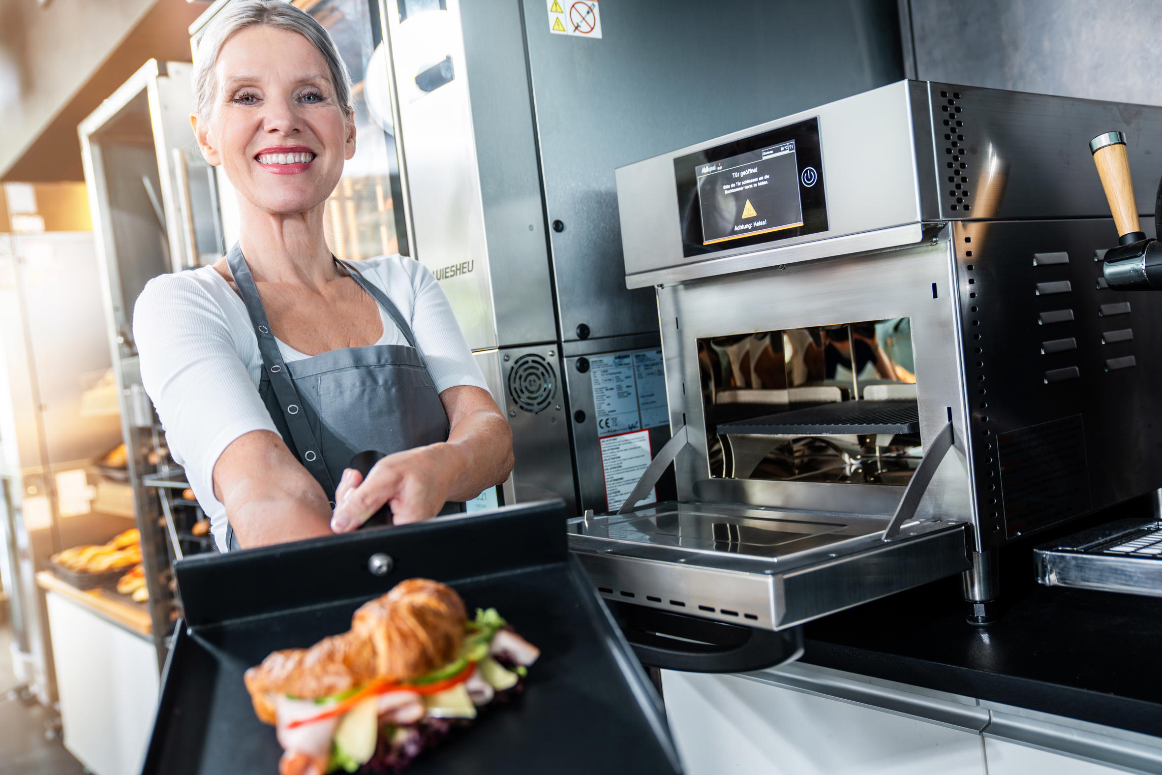 Die Impingement-Technologie erzeugt durch beschleunigte heiße Luft – bis zu fünf Meter in der Sekunde – eine schnelle und gleichmäßige Bräunung sowie eine knusprige Oberfläche. Ergänzend dazu erwärmt die Mikrowelle das Produkt von innen heraus. Das garantiert eine kurze Zubereitungszeit. So benötigen tiefgekühlte Produkte nur zwischen 2,5 und fünf Minuten, gekühlte Waren wie Panini nur zehn bis 45 Sekunden, bis sie fertig sind. Für einen krossen Boden sorgt die integrierte Hot-Spot-Platte, die konstant auf 260 bis 270 Grad erhitzt ist.