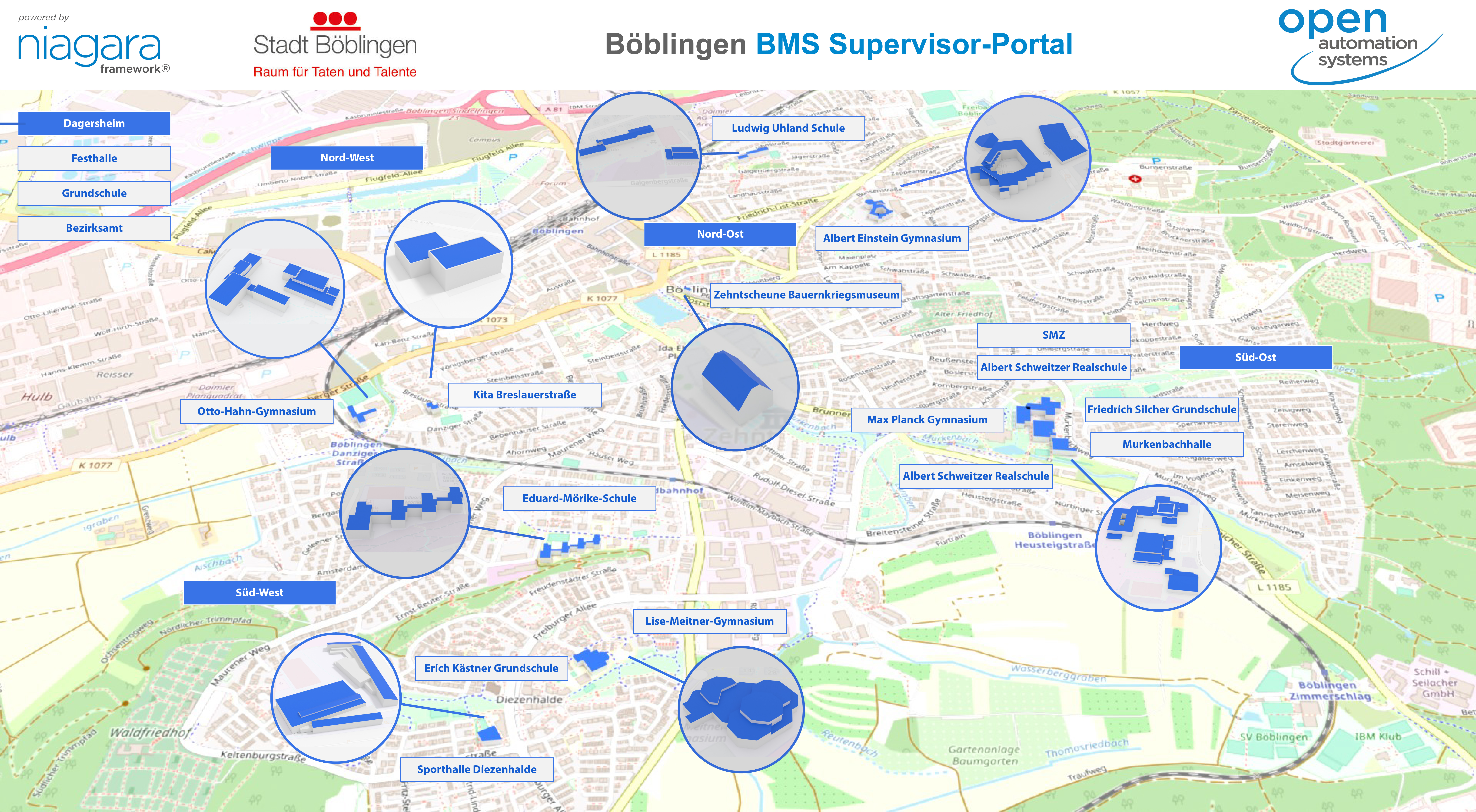 Fünfzehn allgemeinbildende Schulen, Sporthallen, ein Hallenbad und die städtische Feuerwehr – sie alle sollen Teil der neuen Verbundleitstelle der Stadt Böblingen werden. Realisiert wird das Großprojekt mit den auf dem Niagara-Framework basierten Lösungen der von OAS Open AutomationSystems. Die Anforderung an den Sinsheimer Anbieter für offene Energiemanagement- und Gebäudeautomationssysteme: eine verbesserte Energieeffizienz durch innovative Gebäudemanagementsysteme.