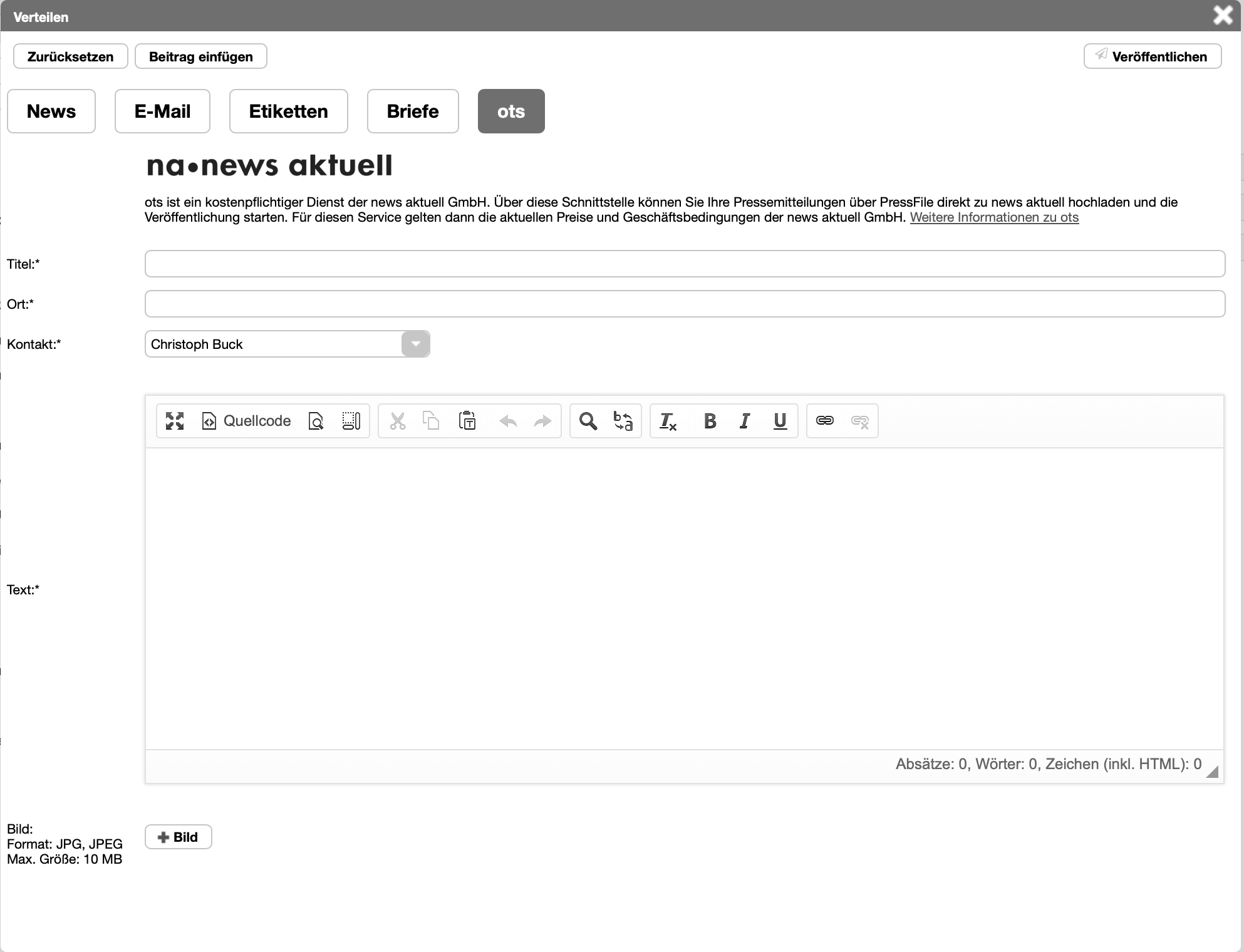 Um den Benutzern die Verteilung der Presseinformationen über die verschiedenen Kanäle zu erleichtern, wurde die ots-Anbindung direkt in den PressFile-Workflow integriert. Im ersten Schritt wird die Meldung für die Veröffentlichung im allgemeinen und/oder einem der eigenen PressFile-Newsrooms erfasst. Danach kann die Meldung mit einem Mausklick sowohl in das Versandfenster für die personalisierten Mails als auch in die ots-Erfassungsmaske übernommen werden. Mit einem weiteren Mausklick wird sie dann zur Prüfung an ots übermittelt und gleichzeitig das entsprechende Fenster auf der Website von news aktuell geöffnet, um den Auftrag dort abzuschließen.