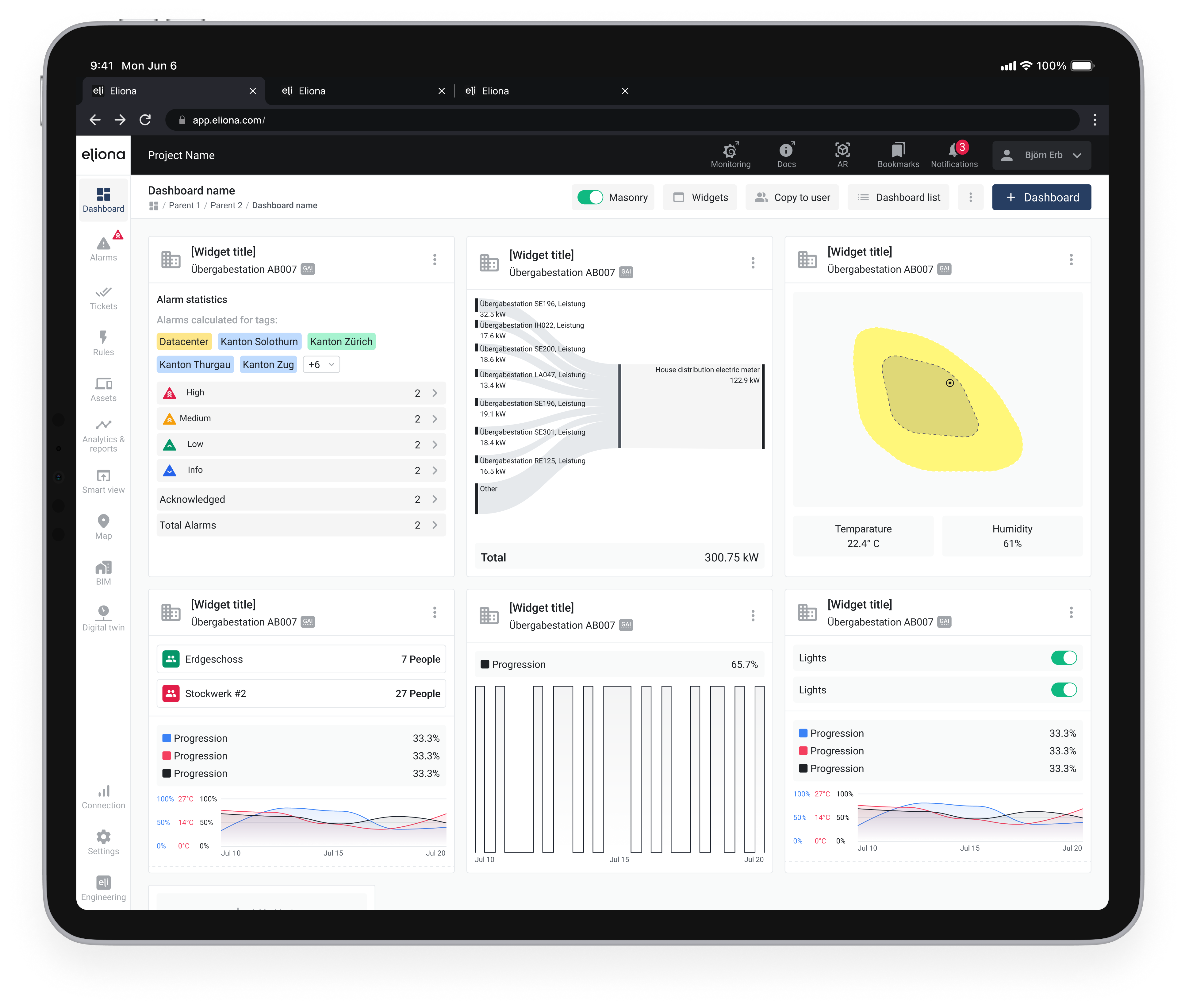 Analoge Infrastrukturen, unterschiedliche Expertensysteme und mangelnde Datentransparenz gehören nach wie vor zum Alltag im Facility-Management. Im Mittelpunkt des Messeauftritts steht daher die Smart-Building-Plattform Eliona – eine systemübergreifende Lösung für das durchgängige, digitale Gebäudemanagement in einer einzigen Anwendung. Die Plattform unterstützt dabei alle gängigen BMS-, IoT- und Betriebstechnologie-Schnittstellen (OT). Ein Dashboard visualisiert die gewonnenen Daten für das Infrastruktur-Monitoring- und -Management, während das umfangreiche Asset-Management mit zahlreichen Funktionalitäten bis hin zu Live-Daten auf der Datenpunktebene aufwartet. Weitere Features umfassen eine Vielzahl von Regeln, Alarmen, Eskalations- und Ticketing-Funktionen für einen ereignisorientierten Gebäudebetrieb sowie individualisierbare Analyse- und Reportingfunktionen. Eine Smart-View-Funktion ermöglicht zudem die Visualisierung der Daten für verschiedene Stakeholder-Ebenen vom Mitarbeiter über das Reinigungspersonal bis hin zum Immobilienbetreiber. Kartenansichten, BIM-Modelle, fotorealistische digitale Zwillinge sowie nicht zuletzt eine hohe Benutzerfreundlichkeit runden die Plattform ab.