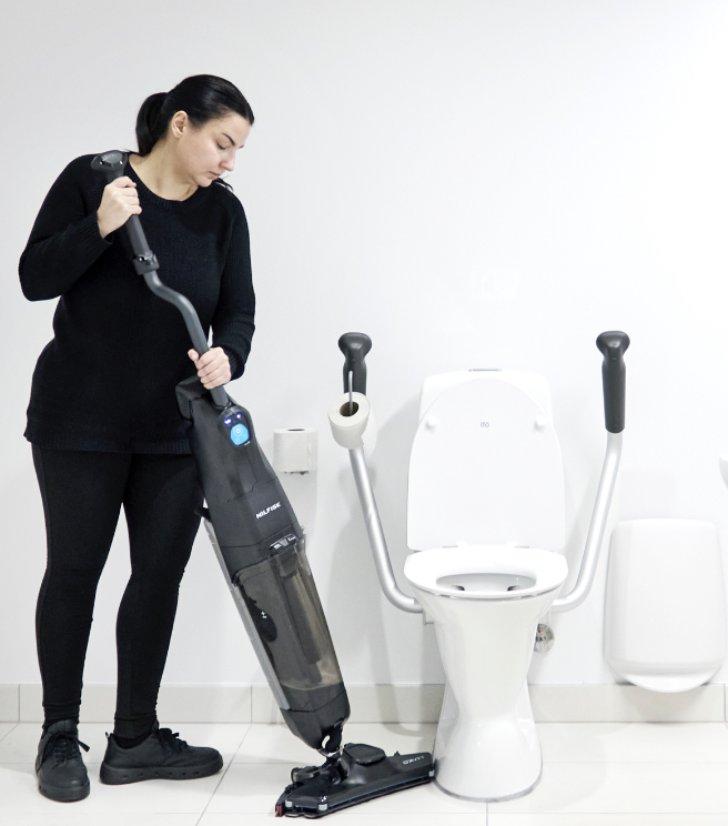 Die hygienische Reinigung von Toiletten, Ruheräumen, Garderoben oder Büros stellt für Öffentliche Einrichtungen sowie für Betriebe jeder Branche und Größe eine Herausforderung dar. Die strengen Vorschriften verlangen dabei von den Reinigungsteams großen Einsatz – gleich mehrfach täglich müssen die teils sehr engen und schwer zugänglichen Bodenflächen und Ecken nass gereinigt werden. In stark frequentierten Eingangs- oder Lobby-Bereichen ist sogar eine stündliche Nassreinigung unumgänglich. Die üblichen Reinigungsmethoden gaben diesen strengen Arbeitsbedingungen bislang keine effektive Hilfestellung: Ein Großteil der Maschinen verfügt nicht über die nötige Wendigkeit, verwinkelte Bereiche und Ecken vollständig zu bearbeiten. Der alternative Griff zu Eimer und Mopp bietet sowohl in puncto Keimverschleppung als auch bei der Ergonomie ebenfalls keine befriedigende Unterstützung.