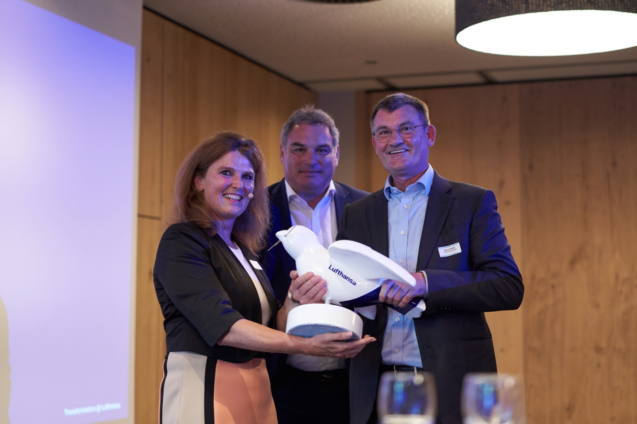 Anschließend ging es in ihrem Vortrag nicht in erster Linie um die Technologien, die sich durch die Digitalisierung ergeben. Im Mittelpunkt standen stets die Möglichkeiten, den Arbeitsalltag jedes einzelnen Lufthansa-Mitarbeiters als Bindeglied zwischen den Fluggästen und dem Unternehmen zu verbessern. Wichtig sei in diesem Zusammenhang eine „Customer Centricity“, also die strikte Orientierung an der Kundenperspektive, um das Handeln jedes einzelnen Mitarbeiters entsprechend abzustimmen. Unternehmen sind gefordert, ihre Angestellten dabei mit den Möglichkeiten der Digitalisierung zu unterstützen. Beispielsweise lassen sich laut Birlenbach „langweilige Tätigkeiten automatisieren und dadurch der Frust beim Personal begrenzen“. Die „Digital Literacy“ (Digitale Kompetenz) sei dafür ein wichtiger Faktor. Lufthansa bietet seinen ArbeitnehmerInnen mit „Future-Fit-Checks“ sowie Online-Schulungsangeboten die Chance zur Eigenmotivation. Als weiteren wichtigen Punkt nannte sie das Talentmanagement, mit dem das Unternehmen bereits frühzeitig die Fähigkeiten von Bewerbern erkennen will. Dafür müssten unternehmensseitig gegebenenfalls die Strukturen angepasst werden – eine Matrixorganisation biete etwa die Gelegenheit, Interessen zusammenzuführen, Prozesslogiken zu etablieren und das Silodenken aufzulösen. Abschließend ging Heike Birlenbach noch kurz auf das Thema „IT-Systeme“ ein. An den Reaktionen der Besucher zeigte sich, dass unterschiedliche Software-Release-Stände nicht nur bei der Lufthansa für Verdruss sorgen können. Gerd Stiefel und Marcello Danieli bedankten sich bei Heike Birlenbach aufrichtig für ihr Kommen und die zahlreichen wertvollen Impulse, aus denen auch die regionalen Unternehmen konkrete Einsatzmöglichkeiten ableiten können, und überreichten ihr ein Geschenk in Form eines Ulmer Spatzen im Lufthansa-Design.