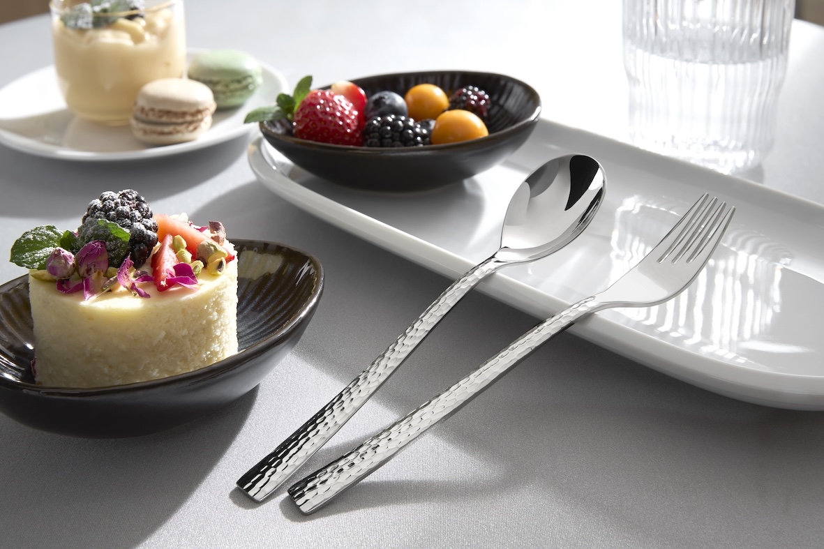 Die Event-Gastronomie entwickelt sich ständig weiter, doch ein Thema bleibt konstant: der Anspruch, Flying Buffets oder Caterings nachhaltiger zu gestalten. WMF Professional trägt diesem Wunsch mit der Besteckkollektion inMotion Rechnung. Die Serie besteht aus vier Besteckteilen: Löffel, Gabel und Messer sowie zusätzlich einem Picker. Trotz der ausgewogenen Proportionen und der eher zurückhaltenden Gestaltung ist inMotion ein Design-Highlight: Der schräge Verlauf am Übergang vom Griff zu den Zinken bei der Gabel besticht ebenso wie die abgeschrägte Messerspitze. Die gehämmerte Oberfläche verleiht dem Besteck zusätzlich einen außergewöhnlichen Charakter. Der Clou ist jedoch die Größe, denn die einzelnen Besteckteile sind im Vergleich zu herkömmlichen Kollektionen deutlich kleiner. Bei Veranstaltungen spielen sie so ihre besondere Handlichkeit aus.