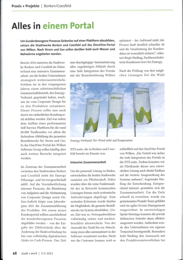 Bereits 2016 starteten die Stadtwerke Borken und Coesfeld im Münsterland eine intensive Zusammenarbeit, um die beiden Unternehmen gemeinsam langfristig strategisch weiterzuentwickeln. Nachdem sie in den vergangenen Jahren einen arbeitsrechtlichen Gemeinschaftsbetrieb – den Emergy-Verbund – gegründet haben, wachsen sie vom Corporate Design bis zu den Produkten zusammen. Nun sollte dieser Prozess auch durch ein einheitliches Kundenportal nach außen sichtbar werden. Ziel war es nicht nur, eine unkomplizierte und performante Self-Service-Plattform für die rund 80.000 Tarifkunden aufzubauen. Besonderes Augenmerk lag auch auf einer lückenlosen Abbildung der gesamten Bestellstrecke für Strom und Gas. Mit dem One2One-Portal von Wilken sollen künftig aber auch weitere Bereiche integriert werden.