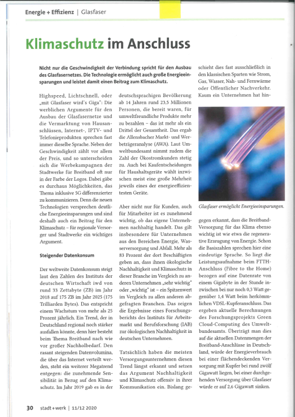 Nicht nur die Geschwindigkeit der Verbindung spricht für den Ausbau des Glasfasernetzes. Die Technologie ermöglicht auch große Energieein- sparungen und leistet damit einen Beitrag zum Klimaschutz.