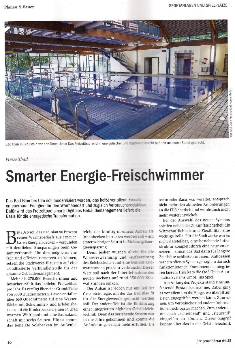 Bis 2028 will das Bad Blau, ein beliebtes Freizeitbad in Blaustein vor den Toren Ulms, rund 80 Prozent seines Wärmebedarfs aus erneuerbaren Energien decken - verbunden mit deutlichen Einsparungen beim Gesamtverbrauch. Um dies möglichst einfach und effizient umsetzen zu können, setzt der Betreiber, die Stadtwerke Blaustein, auf eine cloudbasierte Verbundleitstelle für das gesamte Gebäudemanagement, die OAS Open Automation Systems auf Basis des Niagara-4-Frameworks entwickelt hat.