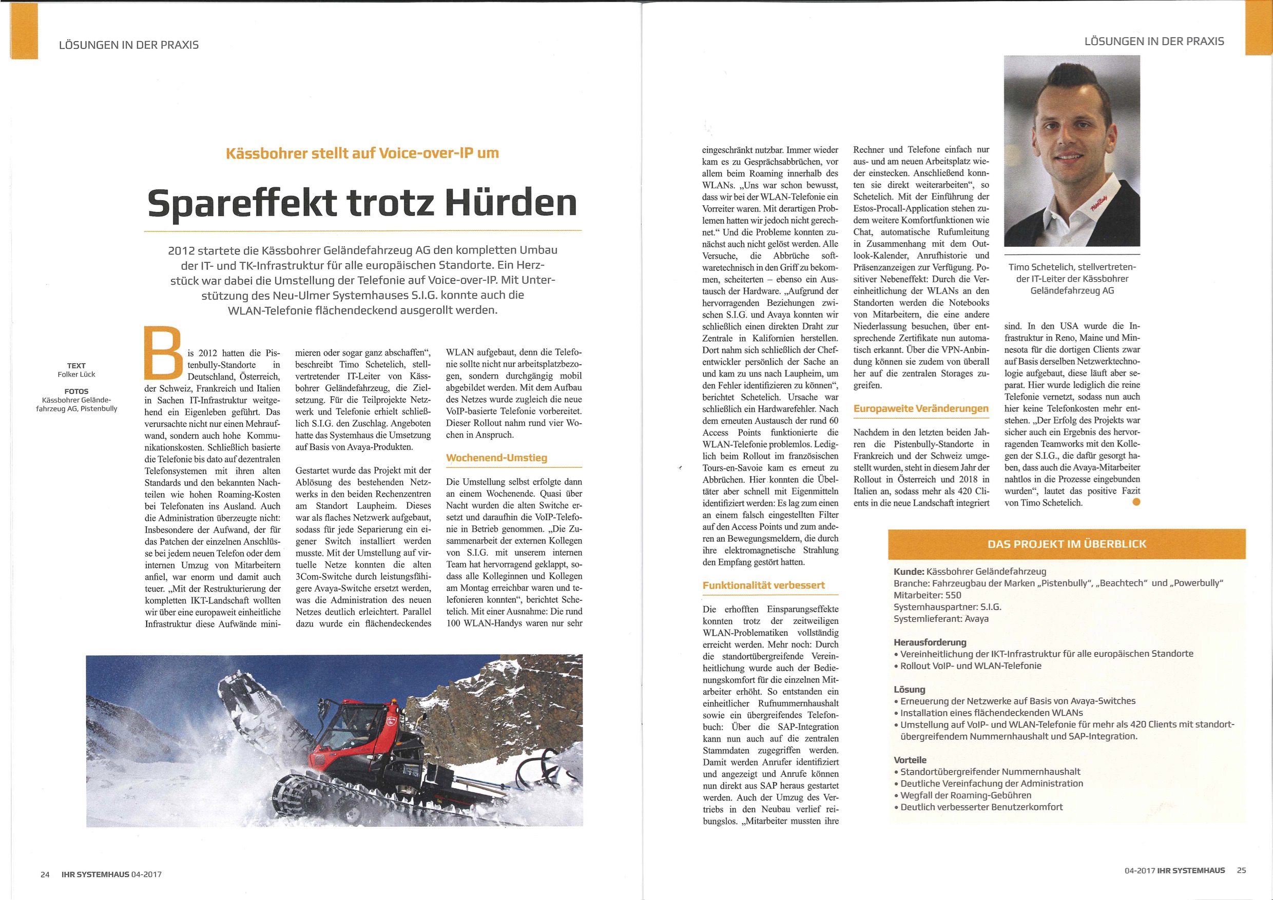 2012 startete die Kässbohrer Geländefahrzeug AG, Hersteller der Marken PistenBully, BeachTech und PowerBully den kompletten Umbau der IT- und Telekommunikationsinfrastruktur (IKT) für alle europäischen Standorte. Ein Herzstück war dabei die Telefonie, die auf VoIP umgestellt wurde. Mit Unterstützung des Neu-Ulmer Systemhauses [s.i.g.] IT mit IQ mbH sollte auch die WLAN-Telefonie flächendeckend ausgerollt werden.