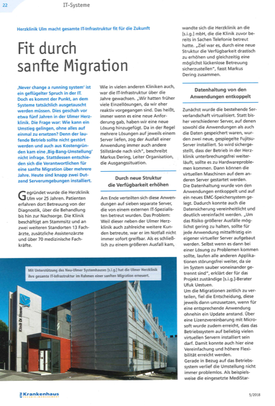„Never change a running System" ist ein geflügelter Spruch in der IT. Doch es kommt der Punkt, an dem Systeme tatsächlich ausgetauscht werden müssen. Dies geschah vor fünf Jahren auch bei der Ulmer Herzklinik. Die Frage war, wie ein Umstieg gelingen kann, ohne alles auf einmal zu ersetzen. Denn der laufende Betrieb sollte nicht gestört werden und auch aus Kostengesichtspunkten kam eine „Big-Bang"-Umstellung nicht infrage. Mit Unterstützung des Neu-Ulmer Systemhauses [s.i.g.] erneuerte die Ulmer Herzklinik ihre gesamte IT-Infrastruktur deswegen im Zuge einer „sanften Migration".