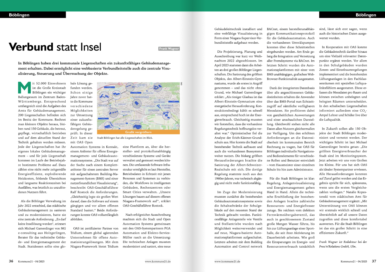 In Böblingen haben drei kommunale Liegenschaften ein zukunftsfähiges Gebäudemanagement erhalten. Dabei ermöglicht eine webbasierte Verbundleitstelle auch die zentrale Visualisierung, Steuerung und Überwachung der Objekte.